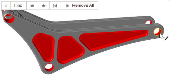 Tip: To find and open a tool, press Ctrl+F. For more information, see Find and Search for Tools.By default, all of the holes in the model are selected and highlighted red. The total number of holes found is displayed above the Holes tool. - Select