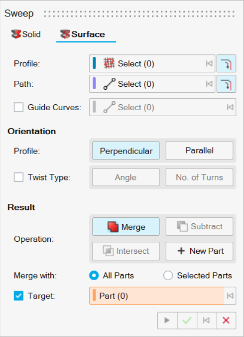 - Intersect (only available for Solids): Retain only the intersecting portions of the extruded shape and the existing parts.