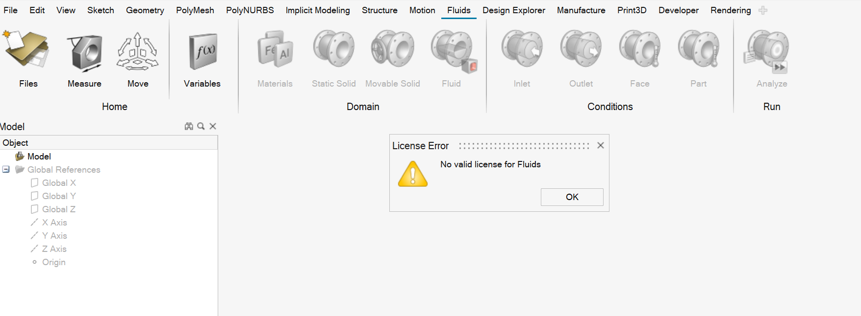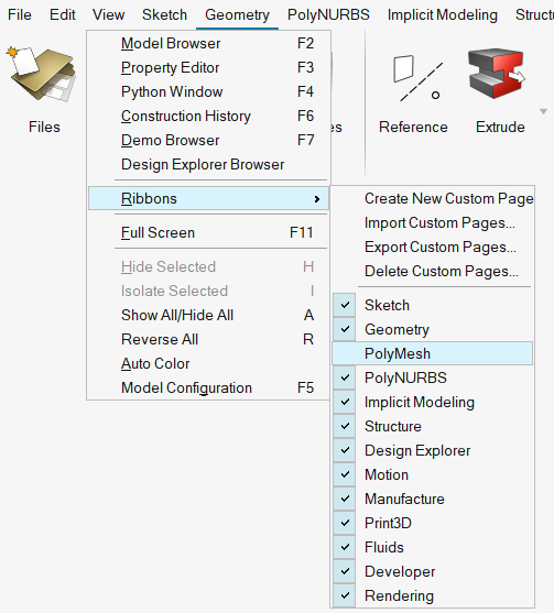 Figure 1. Example: Checking in the PolyMesh tab. In this example, we selected the Fluids tab to exit from the PolyMesh tab. Then we right-clicked the PolyMesh tab to select Check in license feature.