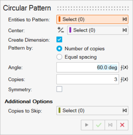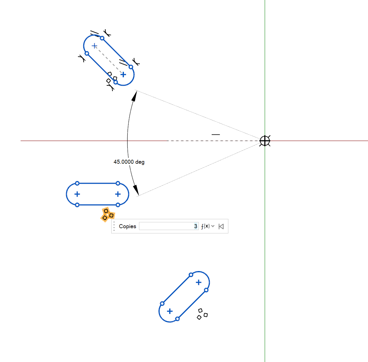 In the guide panel, enter an Angle. Change the number of copies In the guide panel, enter the number of Copies. Pattern symmetrically about the selected center Turn on Symmetry. - Optional: