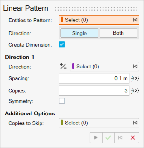 To Do this Change the distance between two copies In the microdialog, enter the Spacing. Change the number of copies In the guide panel, enter the number of Copies. Pattern symmetrically along direction 1 or 2 In the guide panel, for Direction 1 or 2, turn on Symmetry. - Optional: