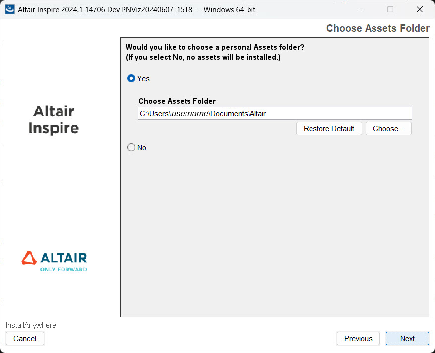 - Accept the default location of C:\Users\<username>\Documents\Altair.