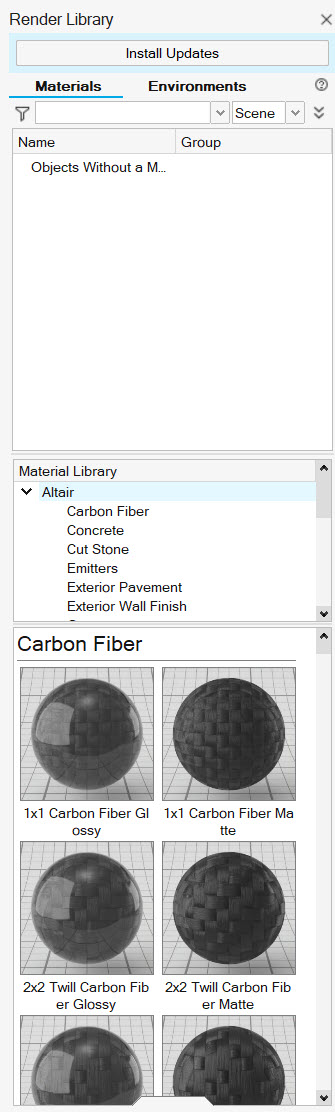 The Assets folder includes a default set of images, textures, materials, models, and environments that are used for rendering. Custom user-created materials and environments are also saved in the Assets folder, in the User subfolder. You can install the full Altair and continue to install updates when the online library is updated.