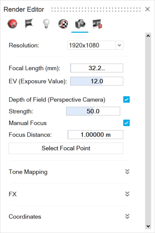 Exposure Value (EV) Controls the camera's shutter speed. Lower values result in brighter images. For an overly bright scene, use a positive value. For an overly dark scene, use a negative value. Depth of Field (Perspective Camera) Adjust the camera focal point and the distance of the focal area. Use a large DOF when you want the entire image to be sharp. Use a small DOF when you want to emphasize the subject and de-emphasize the foreground and background. By default, the camera is automatically focused on the closest point in the scene.Note: Depth of Field requires Display Mode to be set to Quality Render or Performance Render. For the latter, it is available as an approximation.- Strength