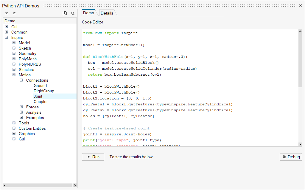 Inspire includes an interactive GUI Demos dialog that provides an introduction to the different GUI components available in Inspire along with source code which demonstrates how to implement these components. That source code can be edited and run directly in the dialog which allows users to “play” with the generated components, or it can be opened in the debugger to step through.