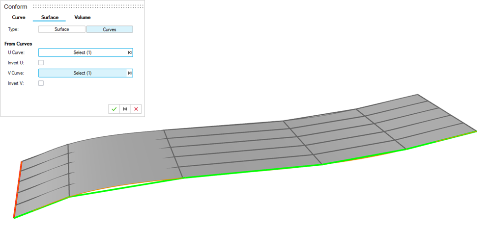 在“贴合”操作面板中,选择体积选项卡,确保类型设置为两个曲面,然后使用从曲面和至曲面收集器,选择要使用哪些曲面来创建共形体积。您可以选择反转 U 和 V 坐标参数化的方向,还可以翻转哪个坐标方向用作每个曲面的 U 和 V。如果两个曲面定义的方向不同,这将非常有用,可以避免在共形区中发生扭曲。
