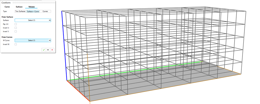 从三条曲线创建共形坐标空间时,可以定义虚拟体积。每条曲线都将用于定义虚拟体积 U、V 和 W 方向的参数化。