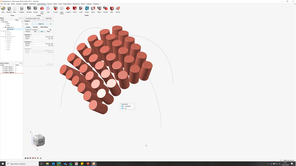 在与曲面共形时,您可以指定模式的间距,使实例以参数 U 坐标和 V 坐标均匀分布,或以长度单位按一定距离分布。通常,最直观的结果来自 U 和 V 的均匀间距。