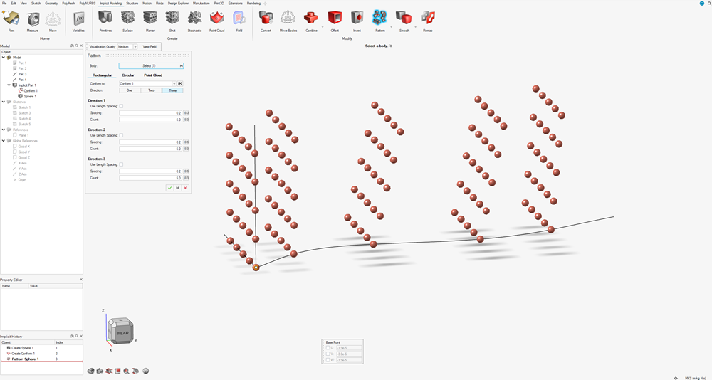 隐式主体可以沿一条曲线进行图案化。所选隐式主体的实例将遵循曲线,并且可以根据参数坐标或长度单位的距离均匀分布。