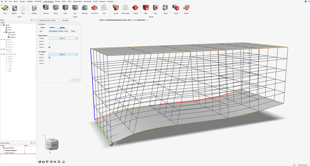 使用“隐式建模”创建的格栅结构可以选择与用户选择的参数 (BRep) 曲面贴合。