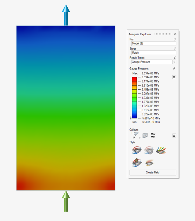注: 在直接创建隐式场时,仅支持附着在实体上的结果。 - Fluids:在 Fluids 功能区,选择分析图标上的显示 Fluids 结果工具。