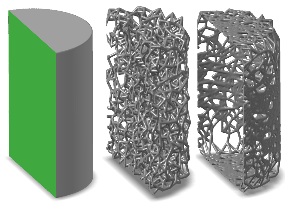 通过定义点、点之间的边、用于移除某些点和/或边的过滤器、将边加厚为支柱的方法以及外部主体处理(例如将格栅结构与外部主体或壳体相结合)来创建随机支柱格栅结构。