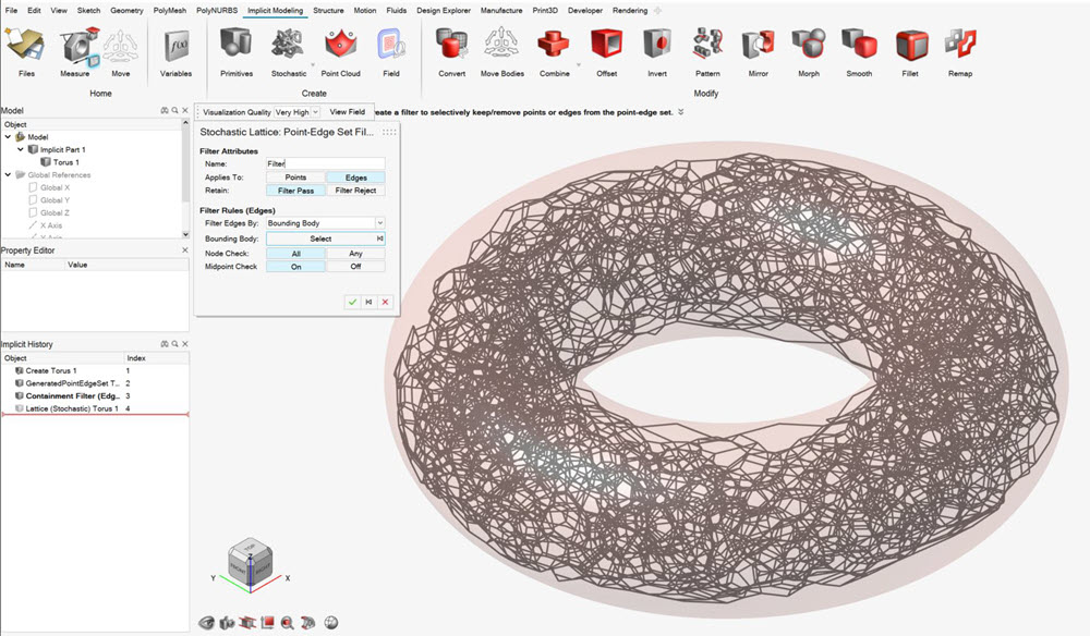 随机格栅结构是由加厚底层结构的线框产生的,该线框由通过边连接的点构成。在 Inspire 隐式建模中,这种线框结构称为点边集。随机格栅结构的一般工作流程如下: