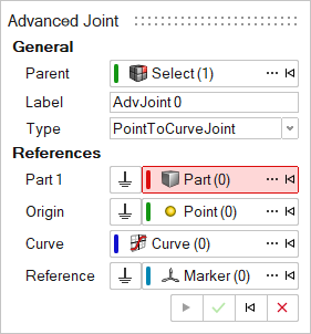 | 零件 1 | 应用高级铰接的零件。此选项仅适用于 PointToCurveJoint。 | ||