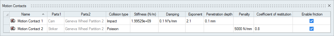“运动接触”表中列出了模型中的所有运动接触,包括每个接触组中的零件以及其他不同的参数。