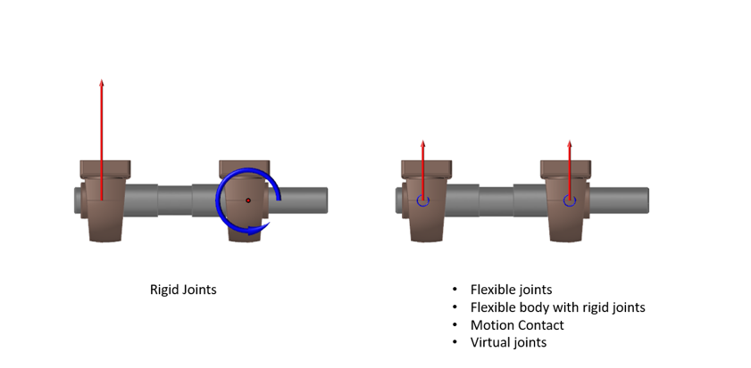 • 使用柔性主体,它们由数百或数千个 DOF 组成。可以将多个刚性运动类型添加到柔性零件,而不会使该零件的约束过多。在对铰接摩擦力进行建模时,这也是一个很好的选择,因为铰接必须为刚性才能考虑摩擦力。