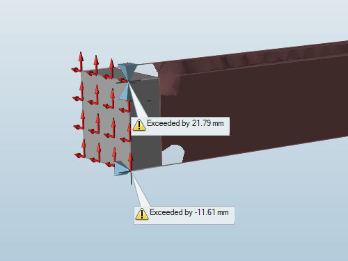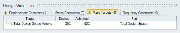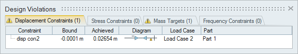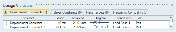 界限表明了最初定义的位移约束上边界值或下边界值。完成列出了在给定约束和载荷工况下得到的实际偏移量。零件显示了承受位移约束的零件的名称。