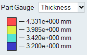 对于厚度优化,“形状浏览器”上带有一个有颜色的图例,显示各零件的测量厚度。您还可以使用下拉菜单更改图例,以显示各零件厚度中的百分比变化。