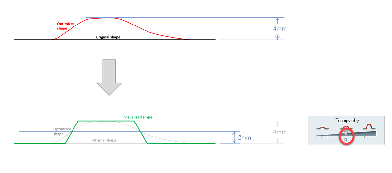 对于形貌优化,左右移动滑块时,结果显示的是零件中的哪些部分需要修改。只显示零件的两个位置:原始位置和完整的拉延筋高度。滑块表示某个高度,超过该高度时拉延筋将被调整为完整高度。例如,如果完整的拉延筋高度为 4 mm,而有些区域的高度为 2 mm,当滑块位置位于中心时,那些高度为 2 mm 及更高的区域将显示为完整高度 4 mm。高度低于 2 mm 的区域将显示为原始高度。这使得可以更容易地可视化结果并将其转化为 CAD 几何。