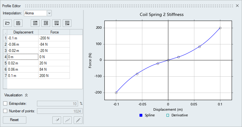 点击该表格图标,打开轮廓编辑器。(下面的刚度曲线示例针对的是螺旋弹簧。阻尼器和扭力弹簧也可使用类似轮廓。)