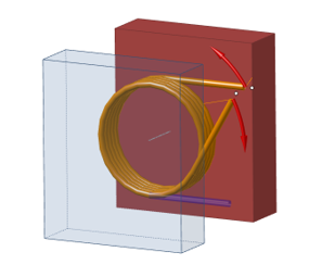 - 可选: 输入弹簧的安装角度 (θ i),或使用图形端点操纵器重新定位。该操纵器有捕捉功能,可以帮助您轻松对齐扭力弹簧臂和模型的边。当您将该操纵器拖动到一条边上,x 轴方向将移动为与该边对齐,其正(或负)方向基于与该边的靠近程度。