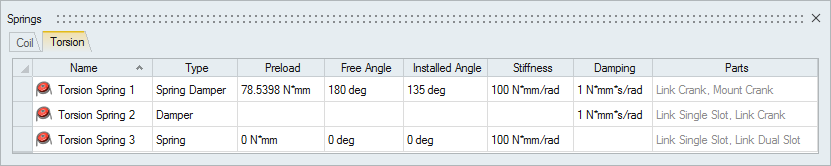 “弹簧”表列出了模型中的所有螺旋弹簧和扭力弹簧,并允许您编辑各种属性。点击扭力选项卡查看扭力弹簧。
