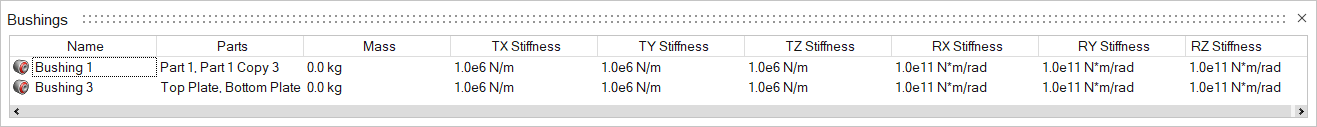 衬套可以在两个零件的两组曲面之间创建,也可以在要接地的单个零件的一组曲面之间创建。您至少需要定义一个线性或转动刚度。质量可选。