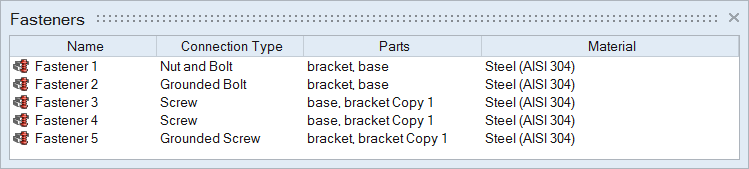 “螺栓连接”表格列出了模型中的所有螺栓连接,其中包括连接类型、连接的零件以及分配的材料。