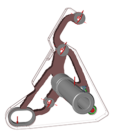 施加位移约束可以限制模型中某个特定的点从最初的位置偏移特定的距离。如下图所示,除了应力约束外,摩托车支架的脚踏上还施加了位移约束。随着脚踏上所允许的位移不断下降,优化后的形状需要更多材料才能抵抗偏移。图 4. 脚踏的位移约束为 2 mm