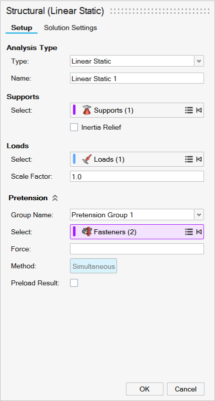 - 选择预载结果复选框,生成仅考虑螺栓连接预张力的附加结果。注: 线性静态载荷仅限于单个预张力组。