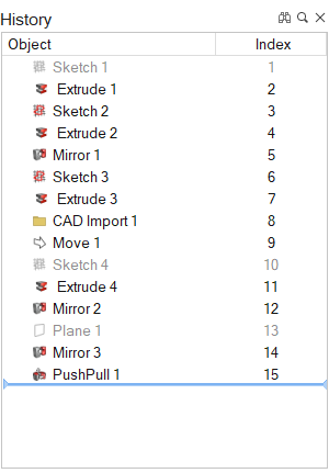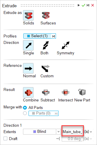 双击 Extrude 1。这是定义 Main_tube_L 变量的地方。要查看完整条目,在操作面板中的范围字段中点击并一直向左滚动,直至 Main_tube_L=5120.0000 mm。模型的这个部分为完全定义。