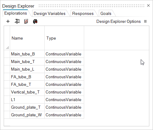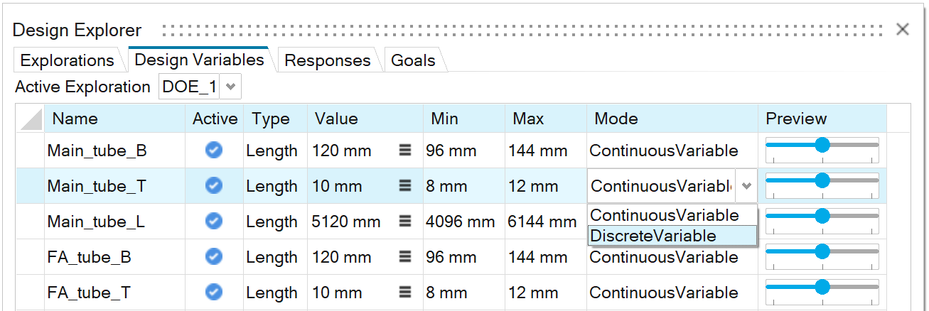 展开“设计管理器”对话框,使“模式”列和“预览”列可见。对于 Main_tube_T ,将模式更改为离散变量。
