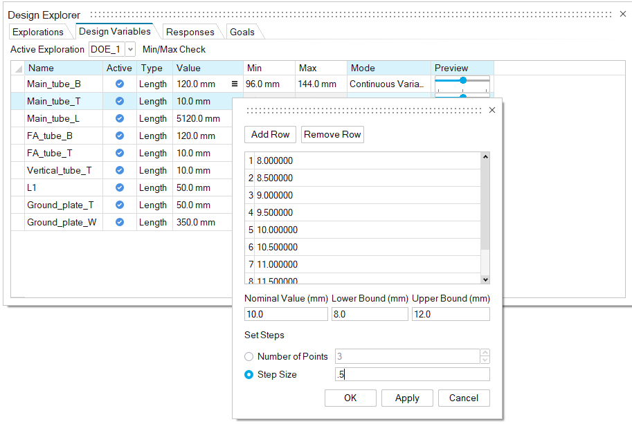 最小值和最大值将从初始变量值中自动生成。Main_tube_B=120 mm + 22.2% 生成 Min=96 mm 和 Max=144 mm。 -