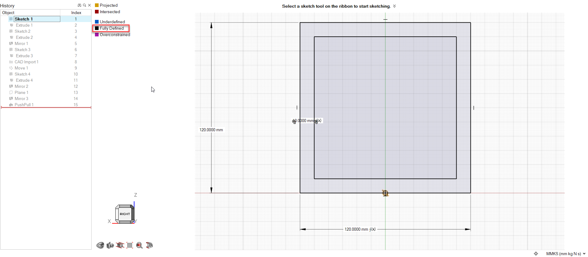 双击 Sketch 1。该草图是黑色的,表明它为完全定义。