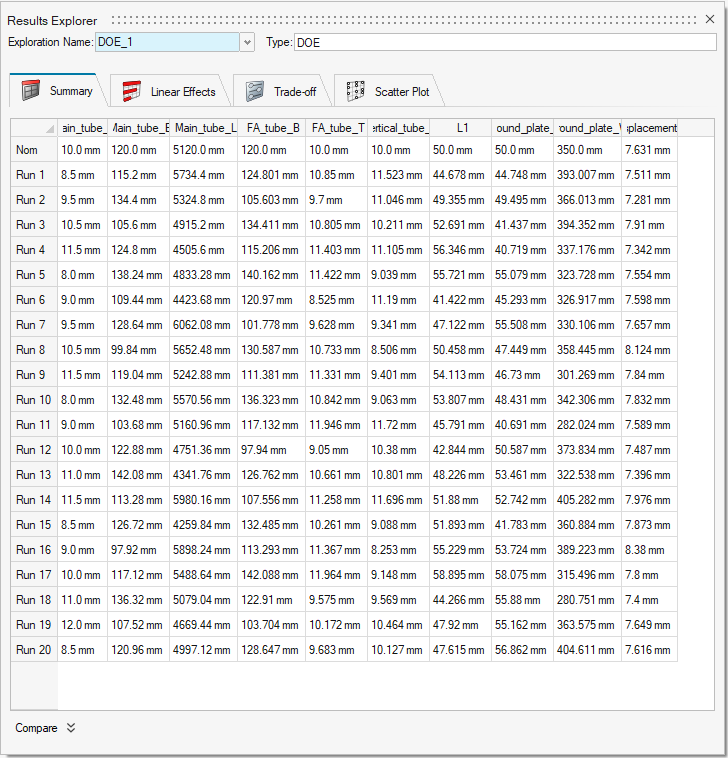 汇总表显示了逐个运行的探索总结。各列显示每次运行的输入设计变量值和相应的响应值。更多信息请见汇总表。 -