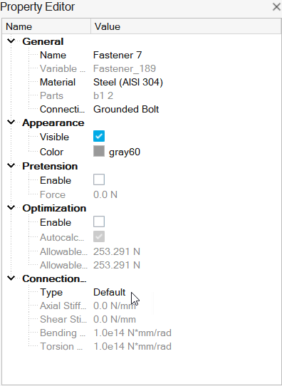 选择其中一个接地螺栓(带螺母)并检验属性编辑器中的连接刚度字段。