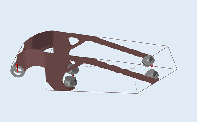 这是平动电机支架可用设计空间的一个曲面模型。注意:所有零件的指定厚度均为 2 mm,设计空间有一个对称平面,载荷已施加,并已使用接地螺栓(带螺母)对零件进行约束。