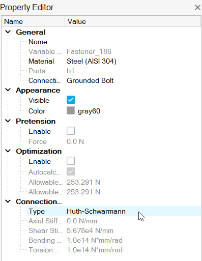 在“属性编辑器”中,将连接刚度类型更改为 Huth-Schwarmann。