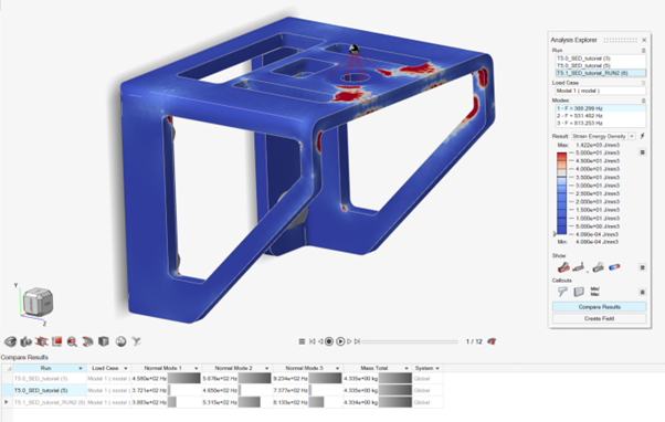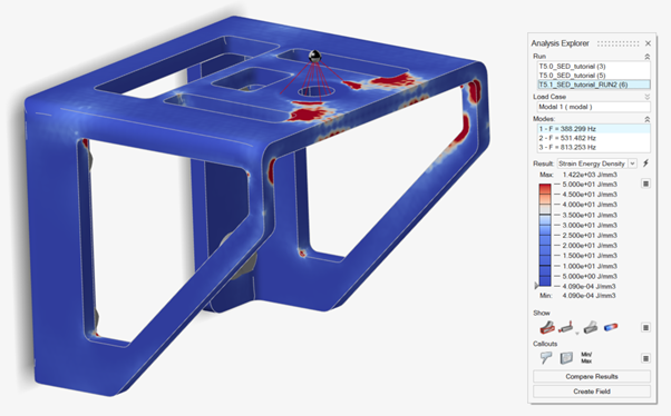 总之,确定应变能密度较高的区域是一种增加结构刚度的有力方法。在本教程中,第一个模态已经显著增加,且没有添加材料。