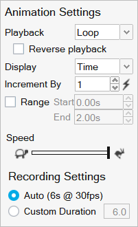 注: 动画工具栏有带自动重复功能的“上一步”和“下一步”按钮,按住其中一个按钮即可在动画中一帧一帧移动。此外,“动画设置”包括反向回放选项。