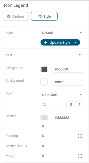 If published, the custom style configuration of the Icon Legend will be added to the Global custom styles list and can be applied to other parts.