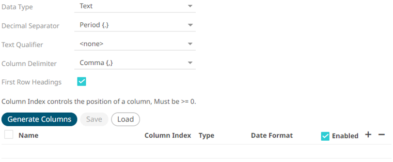 If Text is selected, confirm the Decimal Separator, Text Qualifier, Column Delimiter, and if the first row of the message includes column headings.