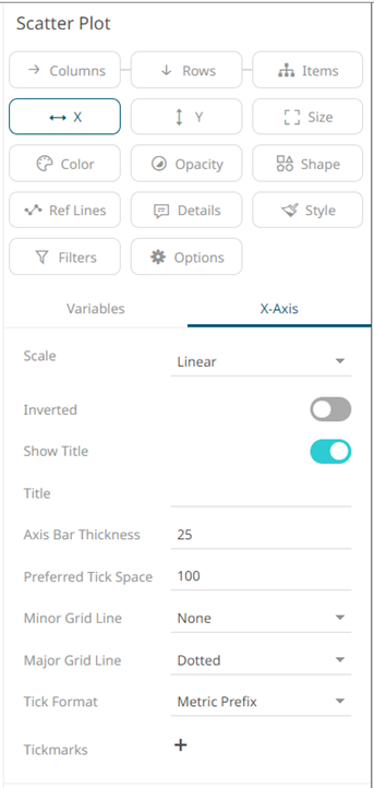 Other visualization-specific properties can be set by clicking on the X-Axis variable drop area and then selecting the X-Axis tab: