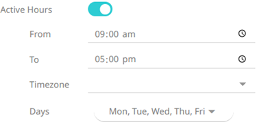 Determines when an alert should be active. Set the From and To time limits, Timezone, and Days.