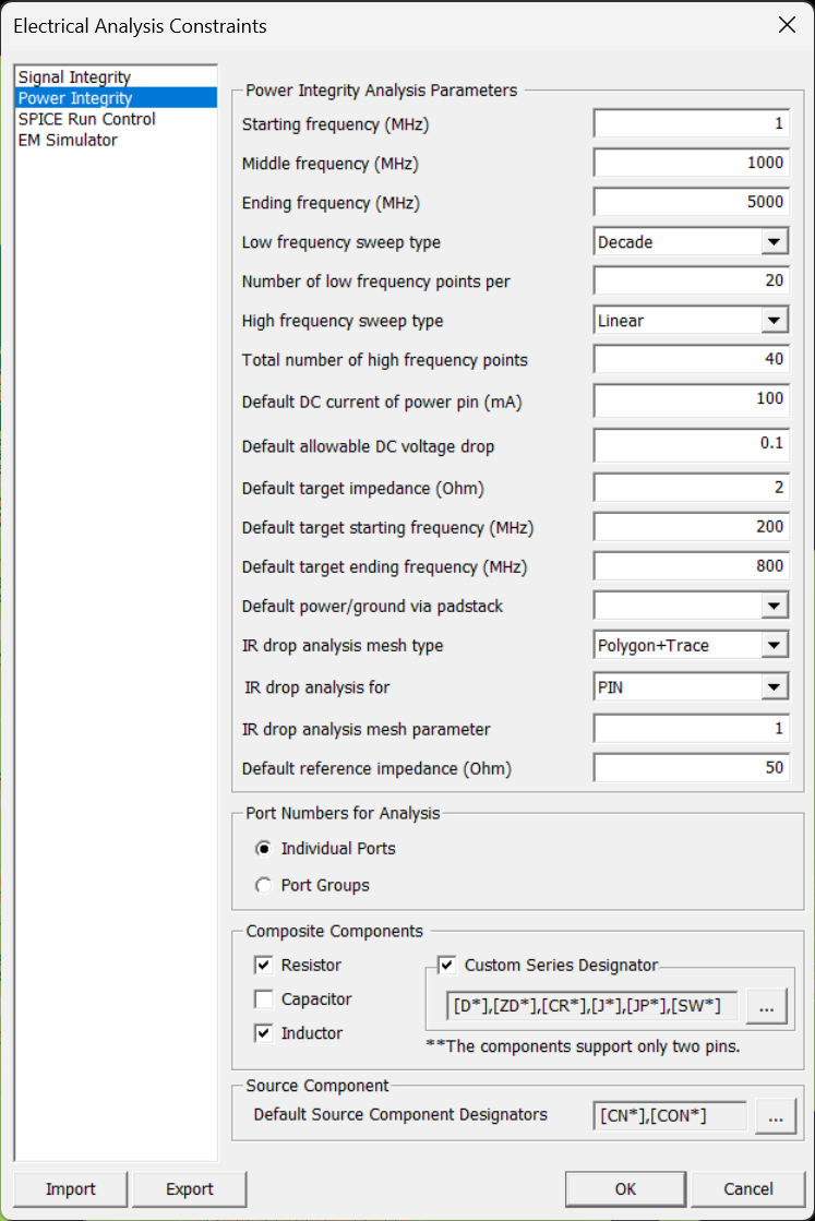 - Default target ending frequency (MHz): default target impedance end frequency for PDN analysis.