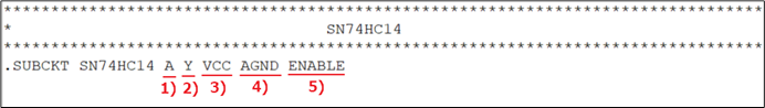 Confirm the SPICE model contains the five ports in the following order: port1 is input, port2 is output, port3 is power, port4 is ground, and port5 is enable.