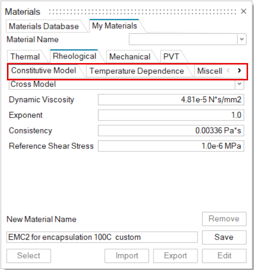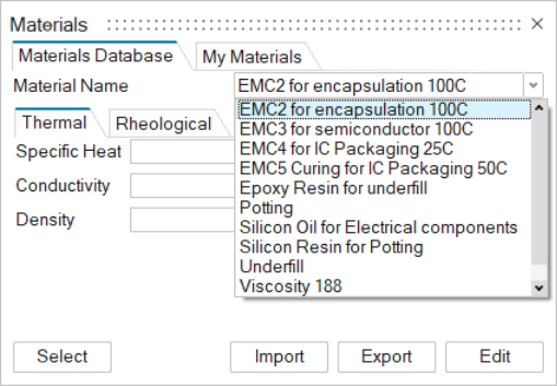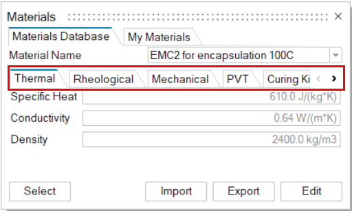 Material properties are accessible from the Materials Database and My Materials tabs