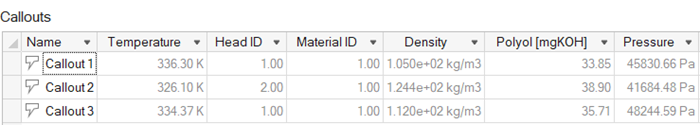 - Selecting a row in the table also selects the callout in the modeling window.
