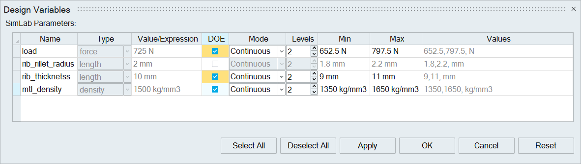 Double-clicking “Design Variables” in the DOE solution will list all the parameters that are read from the parameter file in Parameter Manager. The “DOE” column in this table allows the user to select parameters that the user wants to include for experiments.