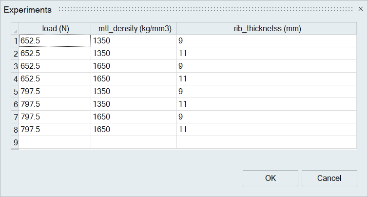A DOE table can be displayed by clicking on “Experiments” in the Analysis ribbon. This will show a table with a set of experiments created based on the parameters defined. This table allows users to add/remove experiments and change the parameter value.